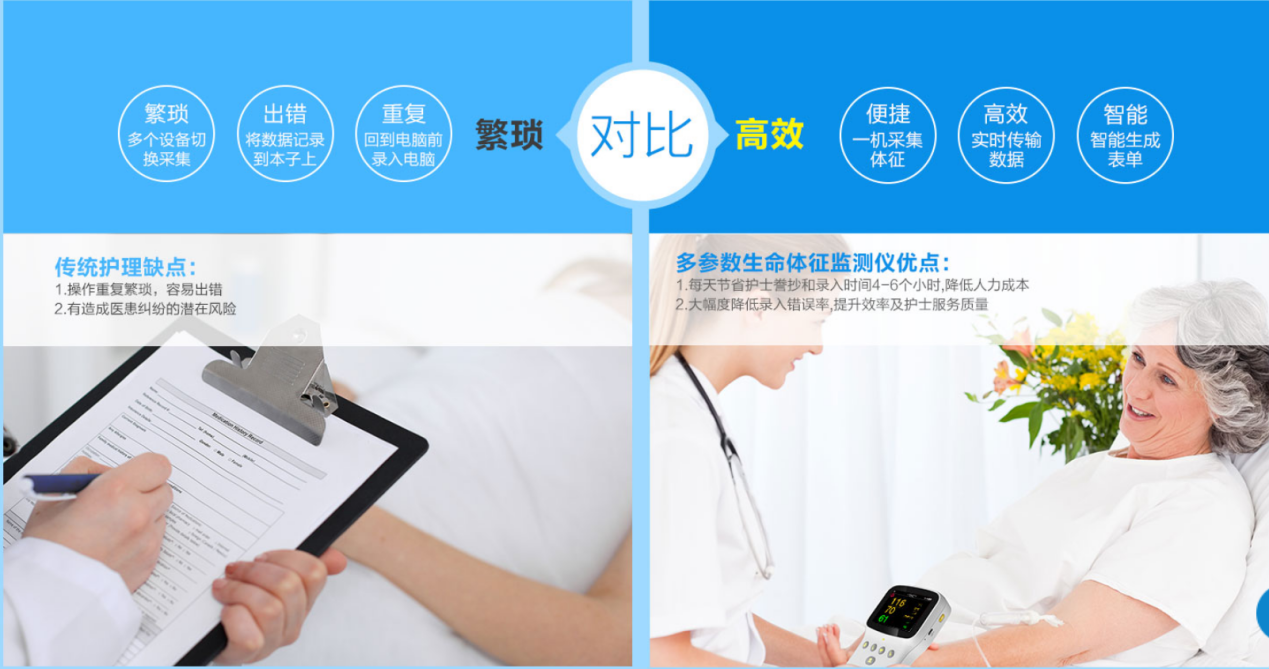 護士可通過一個設(shè)備采集多項患者體征,如體溫、血壓、血糖、脈搏、血氧等,并將數(shù)據(jù)傳送回服務器從而同步到患者相應的移動護理、電子病歷等患者在院診療系統(tǒng)上。