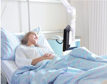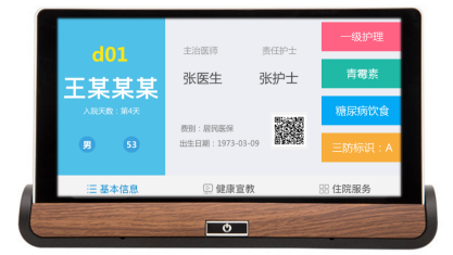 患者可通過桌牌或平板了解自身當前病情狀態(tài),費用查詢并完成在線支付;可以查看多媒體宣教學習相關(guān)病理知識,盡量配合醫(yī)護工作;查看醫(yī)院最新動態(tài)消息,如某某專甲今日在我院出診等等;可以訂餐,通過與醫(yī)院食堂對接數(shù)據(jù)完成訂餐操作。還有院內(nèi)陪護申請,物品申請等多種功能模塊